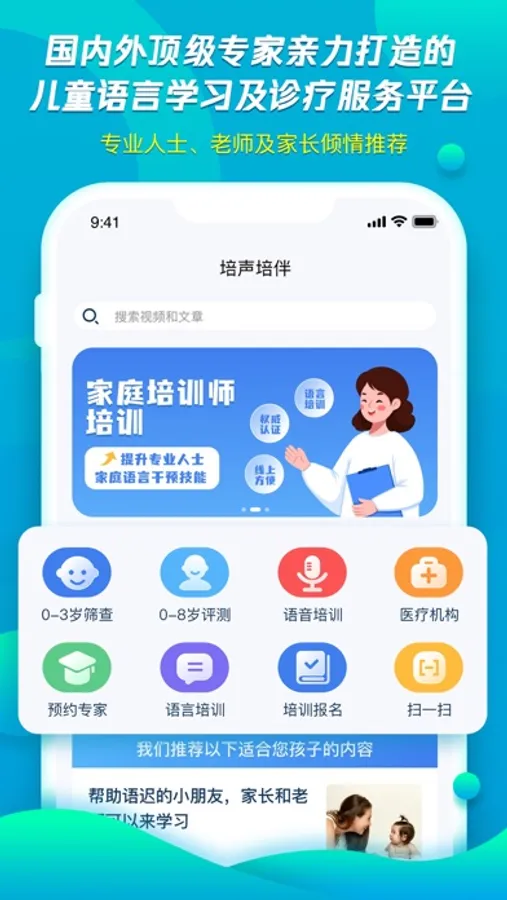 培伴App由国际儿童语言发展专业机构——美国培声听力语言中心根据北美最权威的儿童语言发展家长教育及家庭康复理念与实践设计而成。