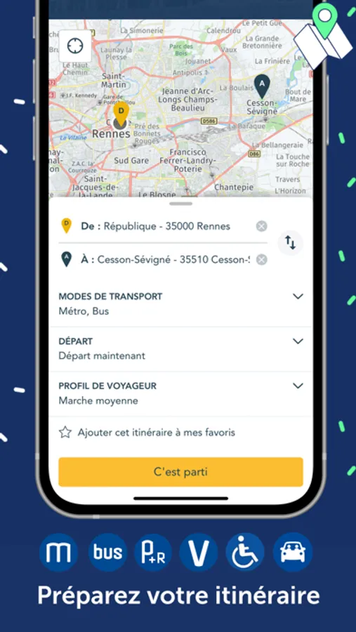 Recherchez votre itinéraire en bus, métro, Parc relais, mais aussi en vélo, en covoiturage, en train ou cars BreizhGo et même à pied !