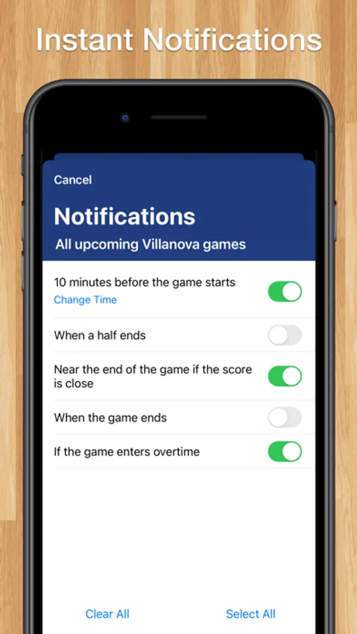 * Never miss a game! Set an alarm and be reminded to tune in.
