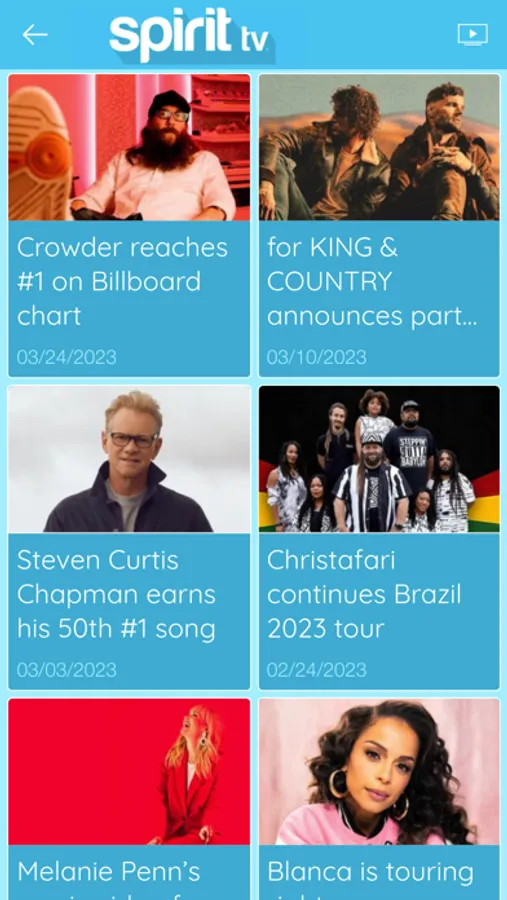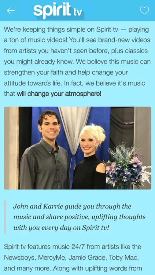 Spirit tv is positive, encouraging music – featuring music videos from artists like the Newsboys, MercyMe, Jamie Grace, Toby Mac, and many more. Spirit tv streams 24/7 commercial-free through this app, our Roku channel, and at MySpirit.tv.