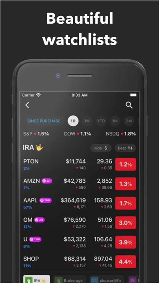 Want to follow other stocks you don't own? No problem, create as many watchlists as you want. Switching between all of your lists and portfolios is insanely fast and easy.