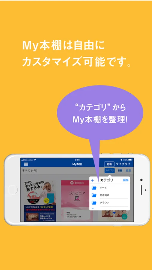 電子書籍(ブック)をウェブ上に全てストックする『ライブラリ』と、使用する電子書籍(ブック)を端末にダウンロードして使う『My本棚』を通常使用します。『My本棚』では、治療別や使用者別など目的別にカテゴリ化して分ける事が出来ますので、より使いやすい本棚にカスタマイズできます。