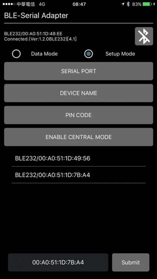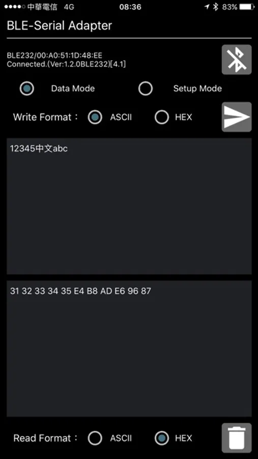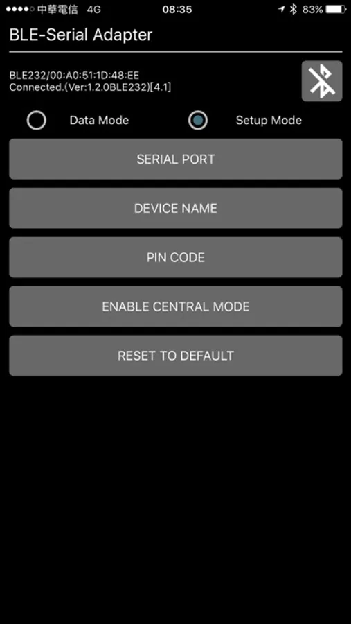 The iOS portable devices will connect with the Bluetooth Low Energy (BLE) to serial port converter devices and exchange data with them bi-directional. The serial port includes RS-232 or RS-422 RS-485 interfaces. The user will test the APP with the SCADA, Robot, UAV, PLC, CNC or etc. with the BLE to serial port devices. The APP will be customized to meet the specific applications.