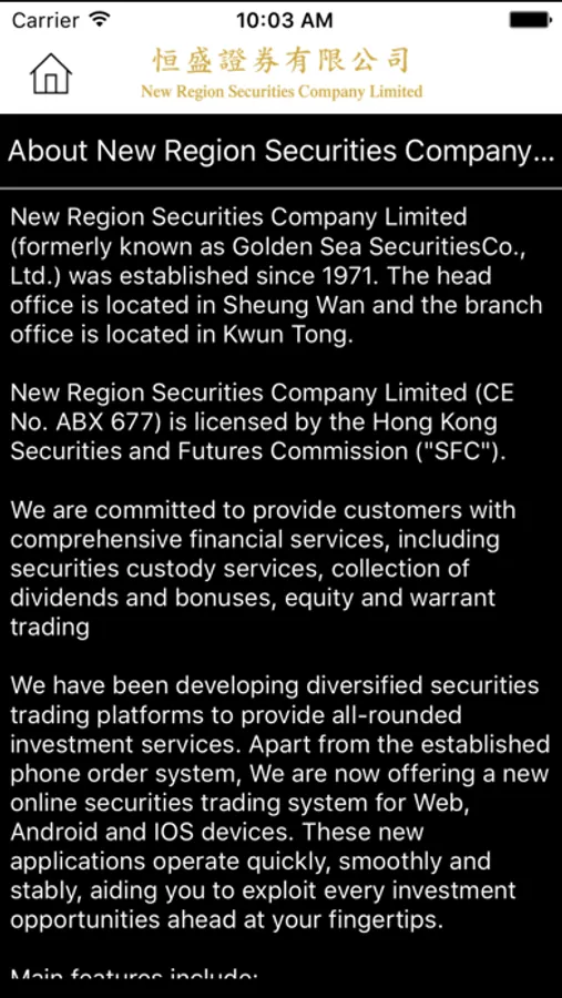 New Region Securities Company Limited has been developing diversified securities trading platforms to provide all-rounded investment services. Apart from the established phone order and online securities trading system, New Region Securities Company Limited is now offering a new mobile securities trading system for iOS devices. This new application operates quickly, smoothly and stably, aiding you to exploit every investment opportunities ahead at your fingertips.