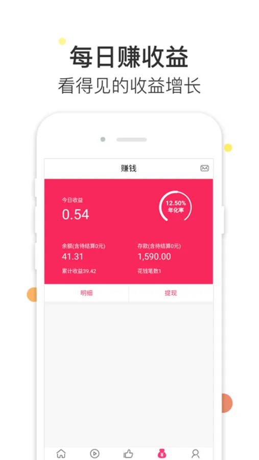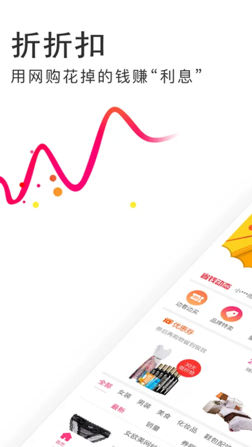 折折扣是一款消费理财式的导购APP,帮用户实现了网购花钱的同时又能赚钱。通过折折扣前往淘宝、天猫购物,每一笔消费都可以存入折折扣钱包,每天产生“利息”收入,利息收入都来自折折扣合作的百万优质卖商家的推广费用。选择折折扣购物,让你的消费产生更多价值。