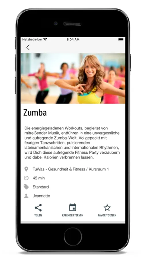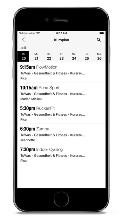 Direkter und aktueller Zugriff auf den Kursplan von überall: Für jeden Kurs kannst Du Details wie Zeit, Kursbeschreibung, Raum und Merkmale wie z.B. den Schwierigkeitsgrad einsehen.