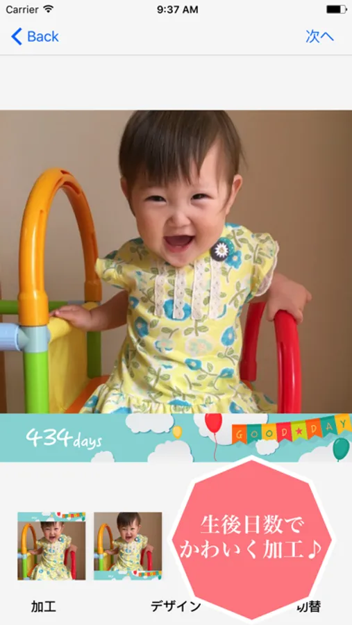 このアプリを使えば子供の誕生日からどれぐらい時間が経ったかを簡単に写真に追加できます。