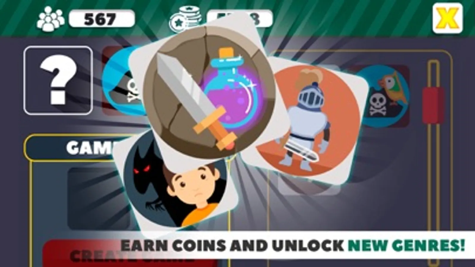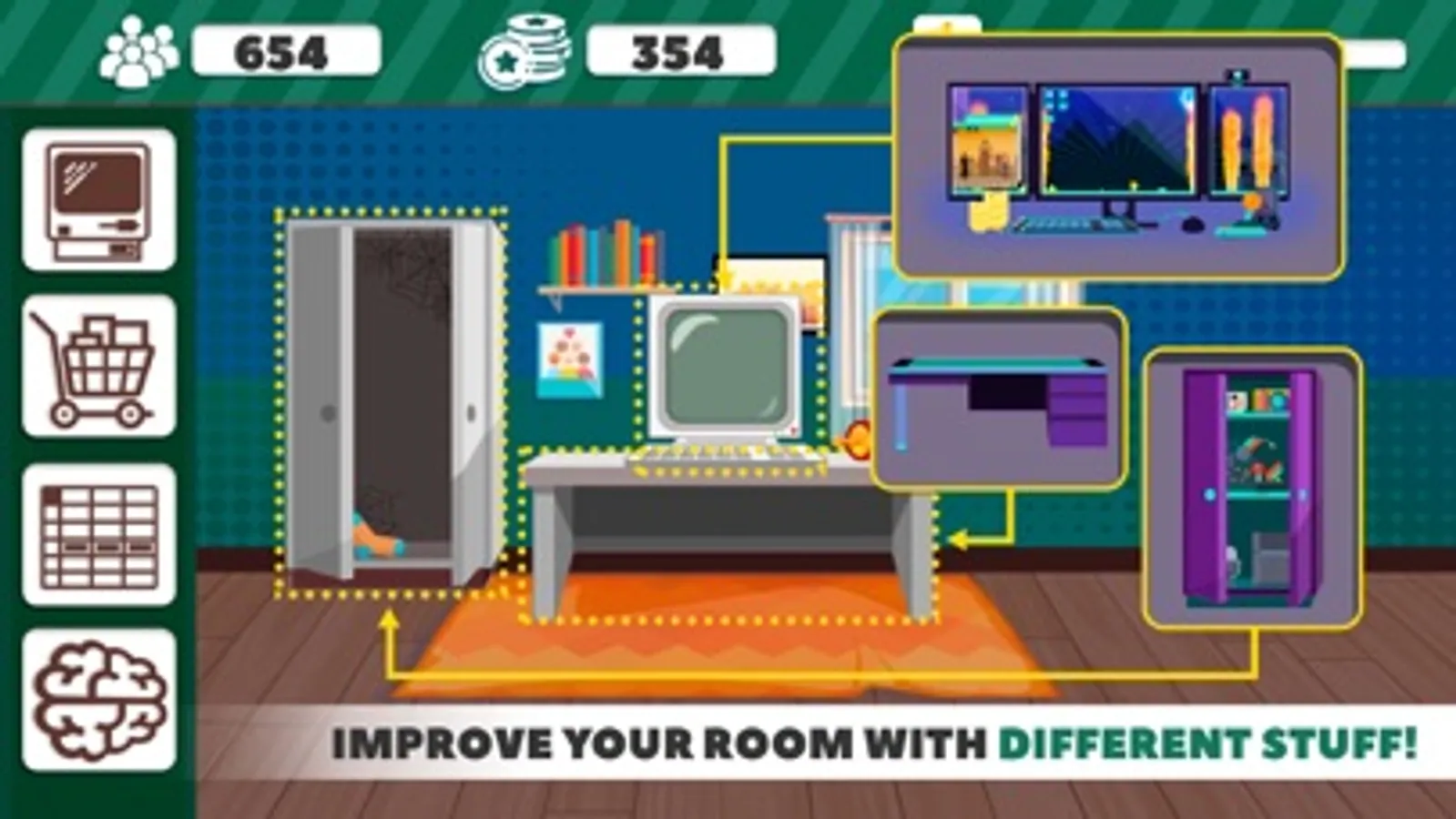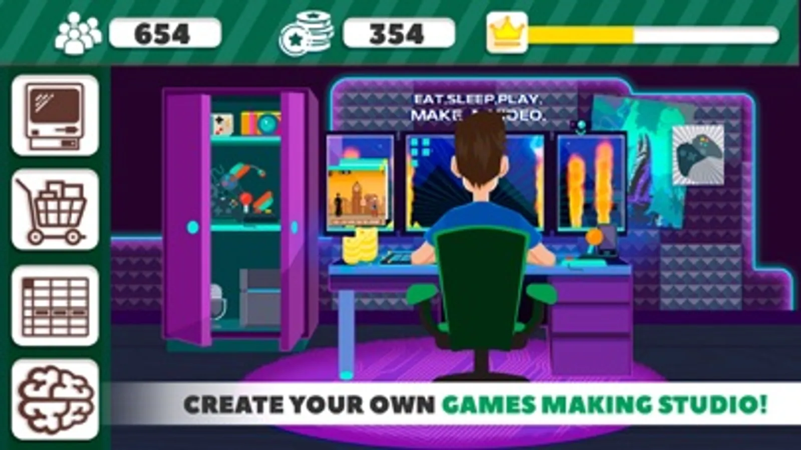 Earn coins for successfully uploaded games and number of fans and unlock all genres for more fun! Do your best and buy new decorations for your room and become the most popular game developer ever!