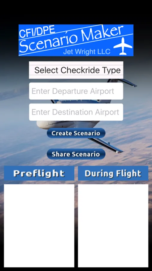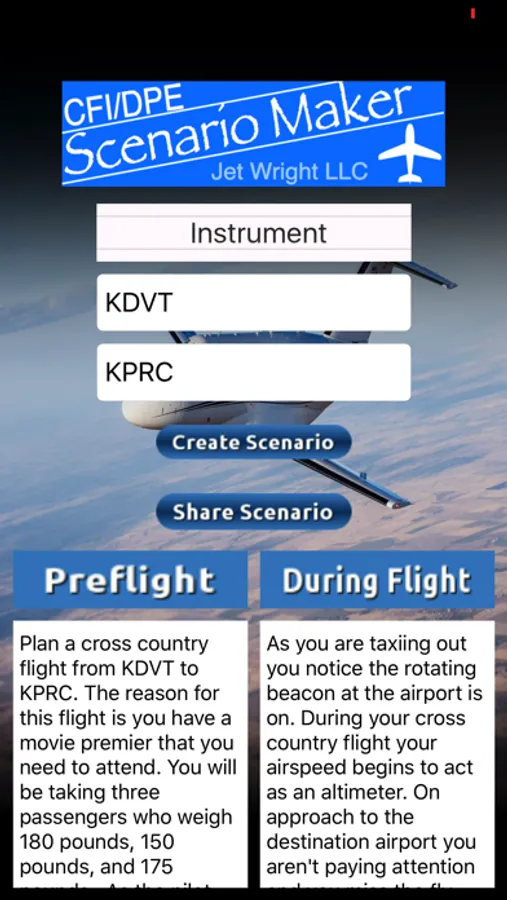 JetWright's CFI/DPE Scenario creator creates randomized scenarios for teaching and evaluating private, instrument and commercial pilots, and for flight students to practice their skills in evaluating a cross-country scenario. The FAA has mandated scenario based teaching and testing and has published a list of events and triggers to use in scenarios to teach and evaluate flight students. This app takes scenario creation to another level. JetWright has included hundreds and hundreds of events and triggers that are all randomized to create a unique scenario each time. This scenario can then be shared with the student/applicant via text or email.