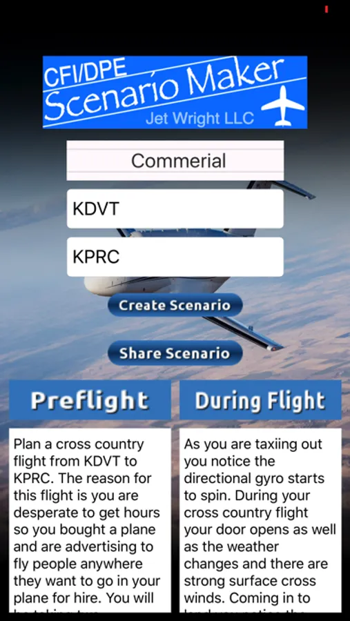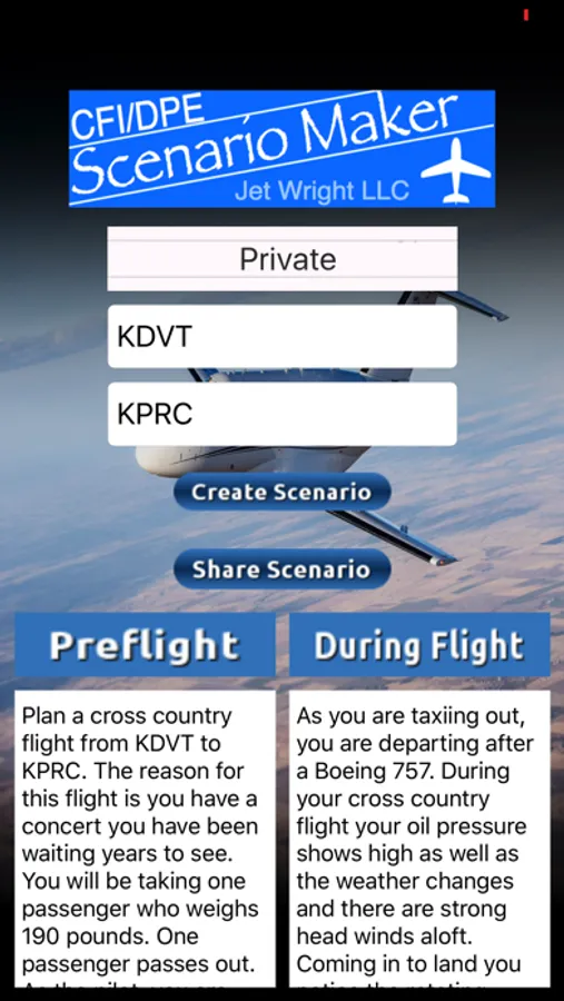 With this app you can get a new, randomized scenario each time you click the "Create Scenario" button. Simply select private, instrument or commercial, put in the origin airport, the destination airport, and click "Create Scenario". This will give you a scenario with two parts: preflight and during flight. If you don't like the scenario that was generated, simply click the button again and you will be given a completely different one. Once ready, click the share button to send the preflight scenario to the student/applicant. The during flight scenario is designed to be a discussion item during a flight test or a ground oral and is not currently designed to be shared. We have included hundreds of events and triggers and will continue to add to the lists.