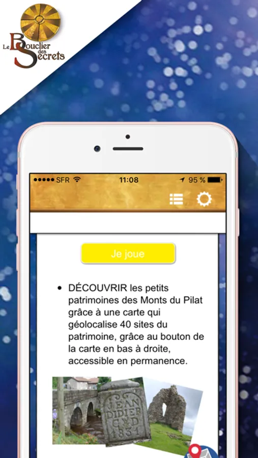 Le Bouclier des Secrets est une application qui propose de découvrir les villages et les petits patrimoines des Monts du Pilat, région située entre St Etienne (Loire) et Lyon.