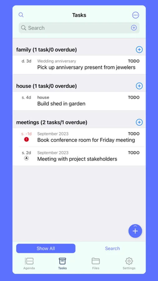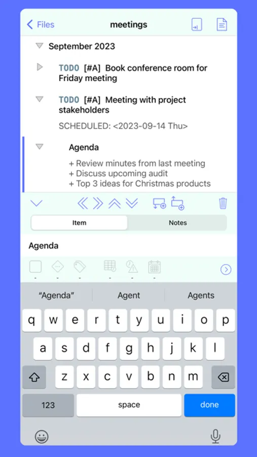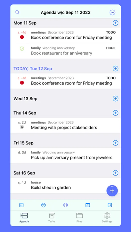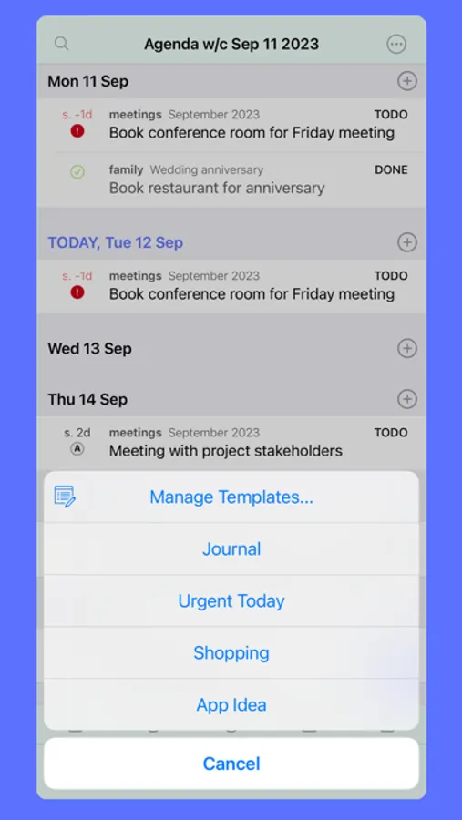 + AGENDA: Gives you a weekly agenda on your iPhone and iPad. Events from your org files are shown alongside those from your calendar.