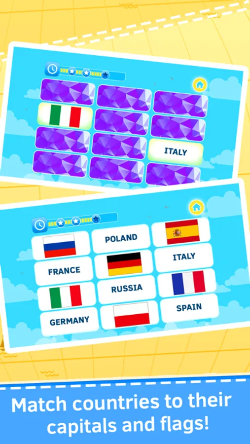 The rules of these match up pairs games are very simple: watch cards to memorize all countries and capitals in the world. Guess the national flags, connect a country and its capital before time runs out. Match pairs quickly and avoid giving incorrect answers to get more stars and unlock new levels!