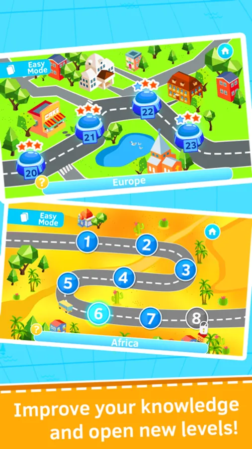 - Challenge yourself in two difficulty modes: easy geography quizzes and hard geographic games