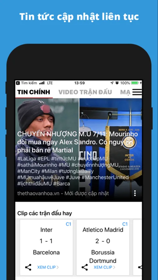 * Tin bài được cập nhật phong phú từ nhiều nguồn khác nhau như báo Thể thao văn hoá, vnexpress, 360 độ thể thao, ... thông qua hệ thống RSS
