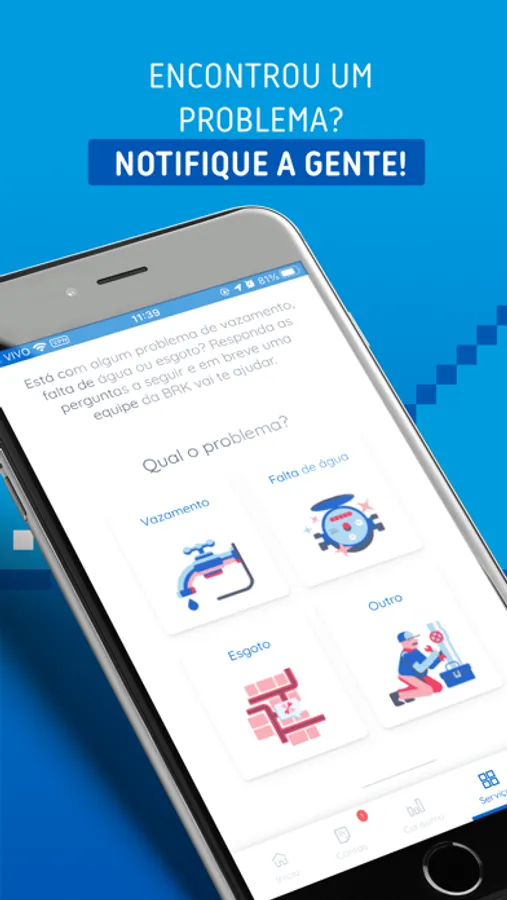 Está com problema de falta de água no seu imóvel ou presenciou algum vazamento no seu bairro? Pelo app você pode reportar esse tipo de situação. Não esqueça de anexar uma foto para facilitar o atendimento!