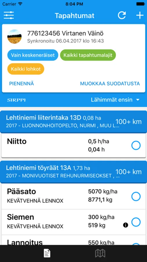 Sirppi hyödyntää peltojen paikkatietoa ja tuo ruudulle oikean lohkon viljelytiedot, kun olet pellolla ja avaat Sirpin. Voit yhdellä klikkauksella kuitata viljelytoimenpiteet tehdyiksi. Voit lisätä ja muuttaa lohkokirjanpidon tapahtumia suoraan kännykässä. Tehokkaan tapahtumasuodatuksen ja kännykän paikannuksen avulla ruudulla on automaattisesti juuri se kylvö tai ruiskutus, jota kaipaat.