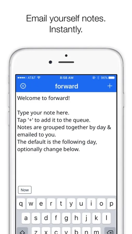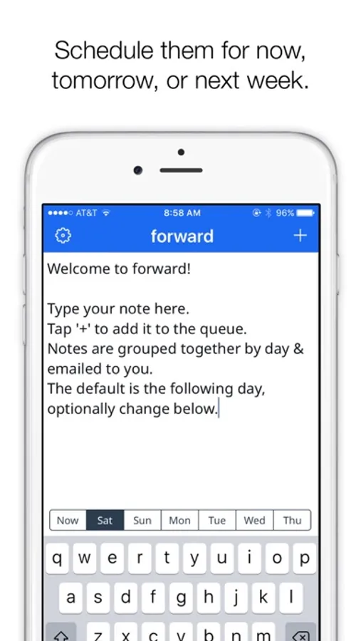 Have a great idea, want to email it to yourself but don't need to think about it right now? Forward it to tomorrow. Or next week. Part rapid note taking app, part time-independent reminder app, Forward makes it easy to:
