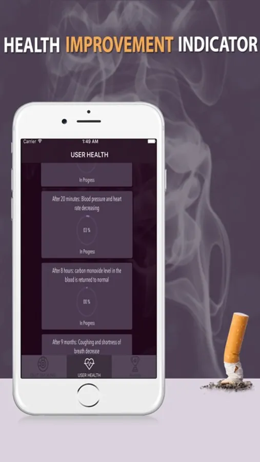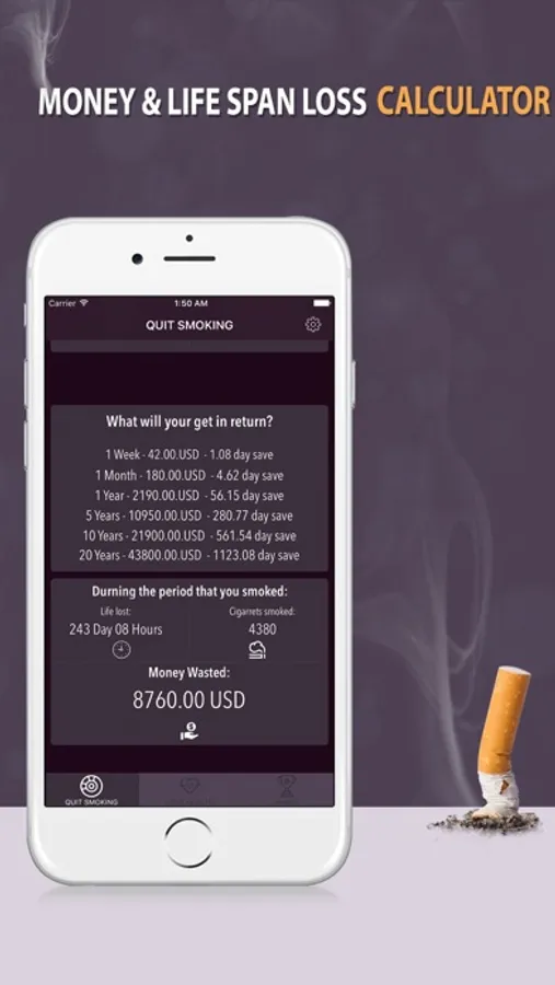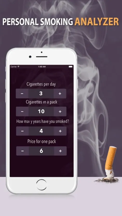 With This data this app will tell you the damage done by smoking and keep you on track the health benefits from not smoking