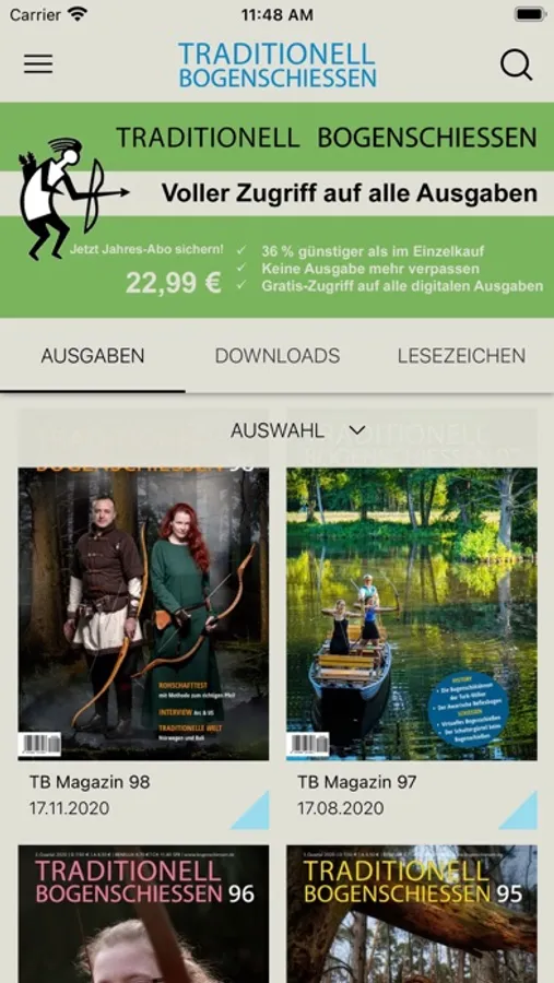 Bitte beachten Sie: Sobald Sie das Abo bestätigt haben, wird Ihr iTunes-Konto mit dem entsprechenden Betrag belastet. Das Abo verlängert sich automatisch um die entsprechende Laufzeit, wenn Sie die Verlängerung nicht bis 24 Stunden vor Ende der Laufzeit in Ihren iTunes-Benutzereinstellungen deaktivieren. Ihre Abos können Sie direkt nach dem Kauf in den Einstellungen Ihres Gerätes einsehen, editieren und die Funktion der automatischen Verlängerung deaktivieren. Wenn Sie Ihr Abo nicht deaktivieren, wird Ihr iTunes-Konto innerhalb der 24 Stunden vor Ende Ihres Abonnements mit dem entsprechenden Betrag belastet. Eine Rückvergütung ist nicht möglich, sollten Sie das Abonnement während der Laufzeit kündigen wollen. Sie erhalten in jedem Fall alle Ausgaben bis zum Ende der abgeschlossenen Laufzeit. Weiterführende Informationen zum Datenschutz (https://www.bogenschiessen.de/datenschutzerklaerung/) und den AGBs (https://www.bogenschiessen.de/impressum/)