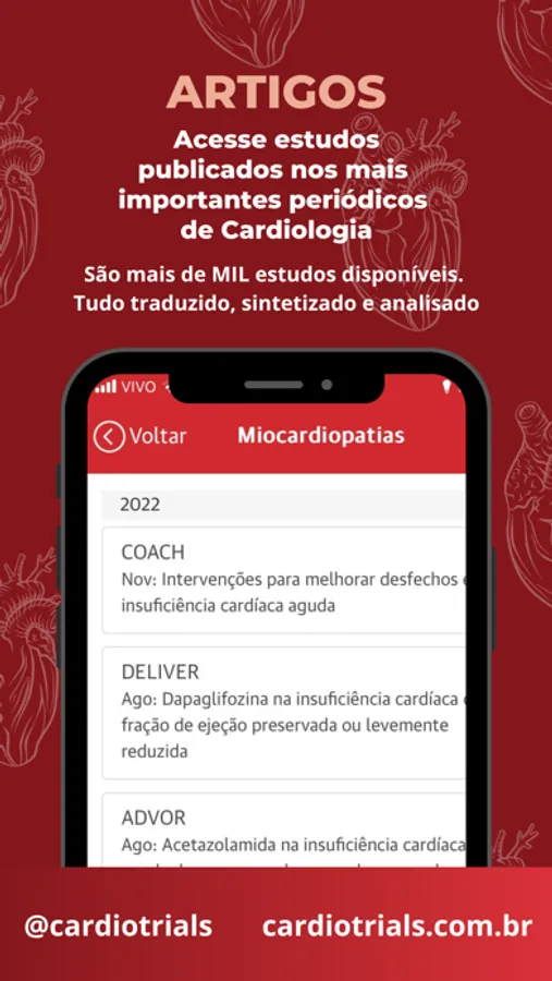 - Artigos: nossa biblioteca conta com mais de MIL trials clínicos publicados nos maiores periódicos de cardiologia do mundo. Todos sintetizados e traduzidos para português.