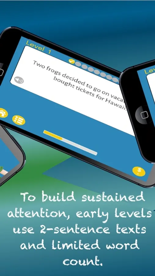 To build sustained attention and working memory, early levels contain 2-sentence texts with limited word count. As comprehension is demonstrated and memory increases, the texts increase in length and difficulty.