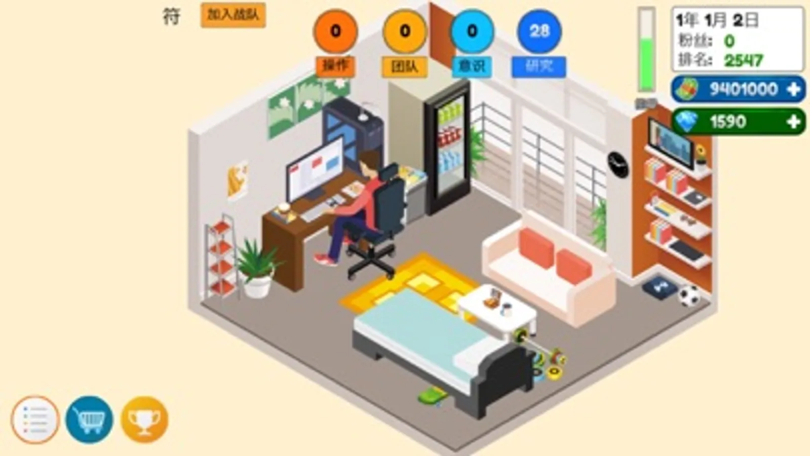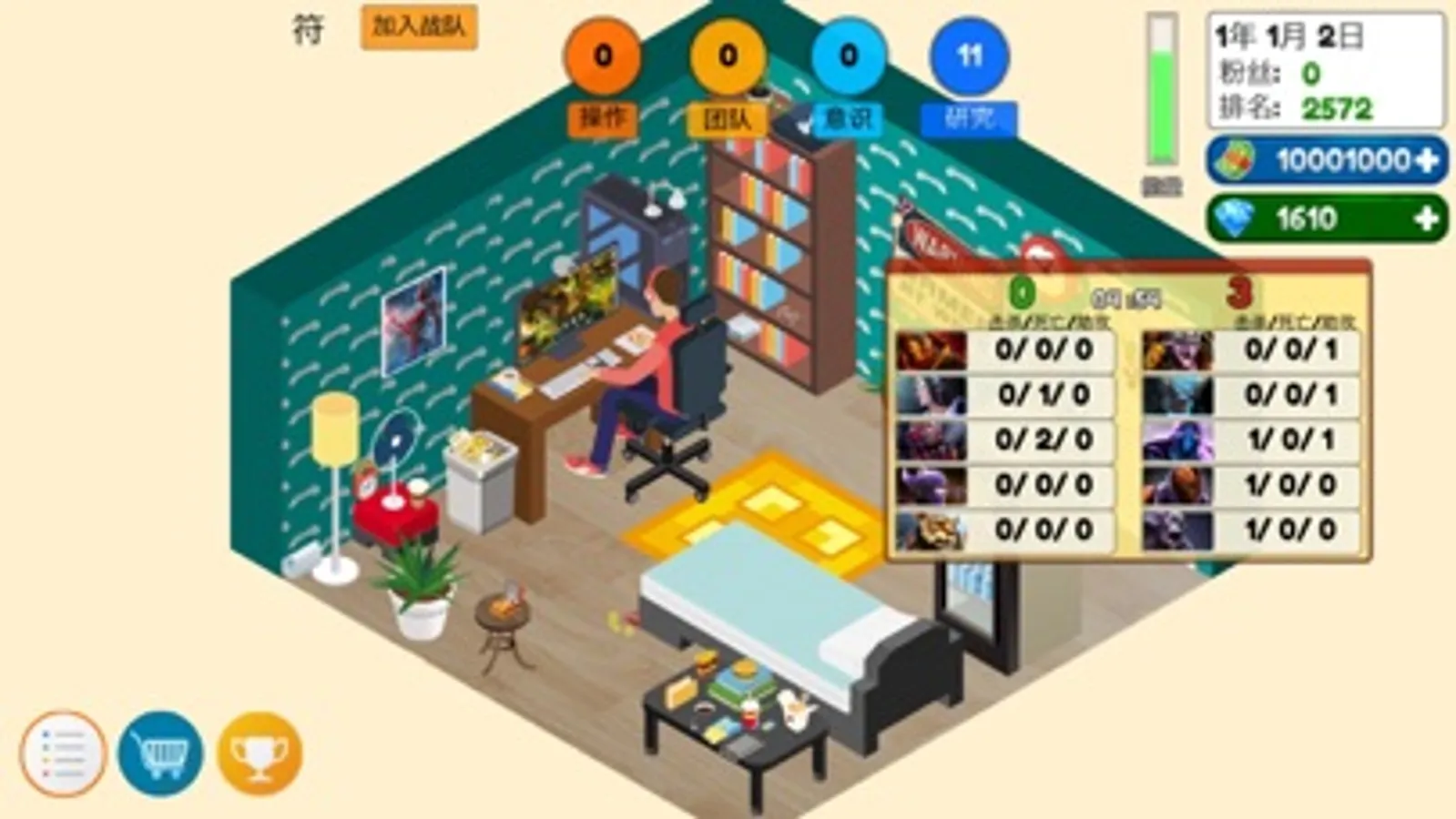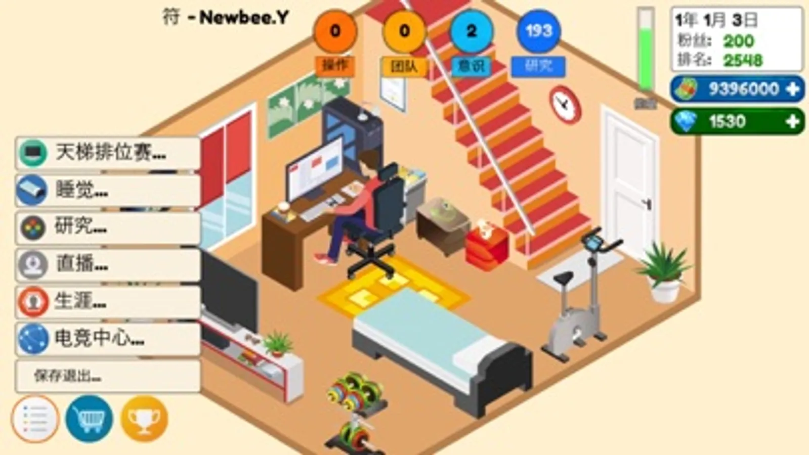 User needs to manage a gaming café, upgrade it and host gaming tournaments. In the meanwhile, user can hire gamers to form a team and participate in the tournaments.