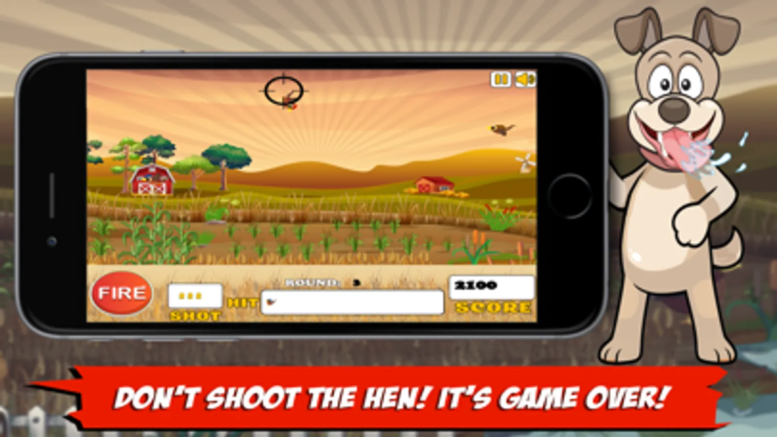 This game and story is dedicated to my hunting dog. Hunter who was a Brittany Spaniel, what and amazing dog. So of course the dog in the game is named Hunter. He's here to help you retrieve the birds you shoot, and laugh at you when you miss. Dodge and Bullet are the main Pheasants in the game. They are here to challenge you as you move through the Rounds. DON'T SHOOT THE HEN!! Shooting the hen will end your game and back to Round 1 you will go...