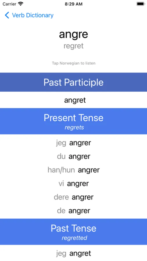 Learn and practise Norwegian (Bokmål) verbs with this interactive verb reference and drill tool. With over 350 core verbs, Norwegian Verb Blitz is a clear and effective way to refresh and revise your grammar skills as well as expand your everyday vocabulary.
