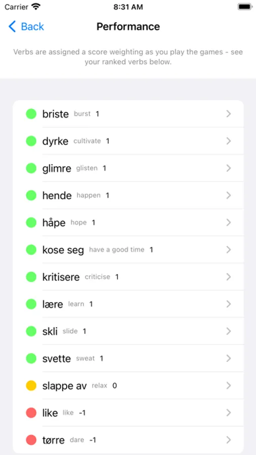 The app will track your scores throughout the games, so you can check in the Performance section at any time to see the entries you're finding trickiest.
