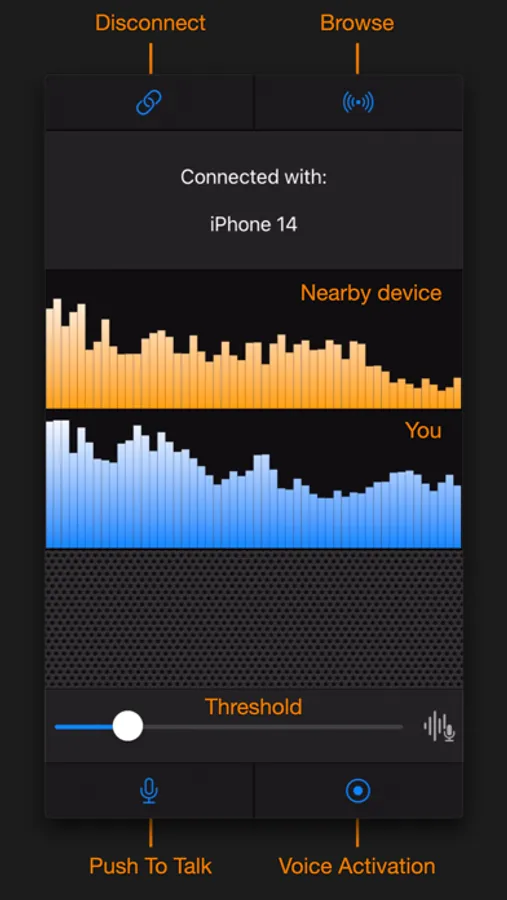 Choose between "Push To Talk" or "Voice Activation" functions with threshold setting (you can adjust the sensitivity of the microphone).