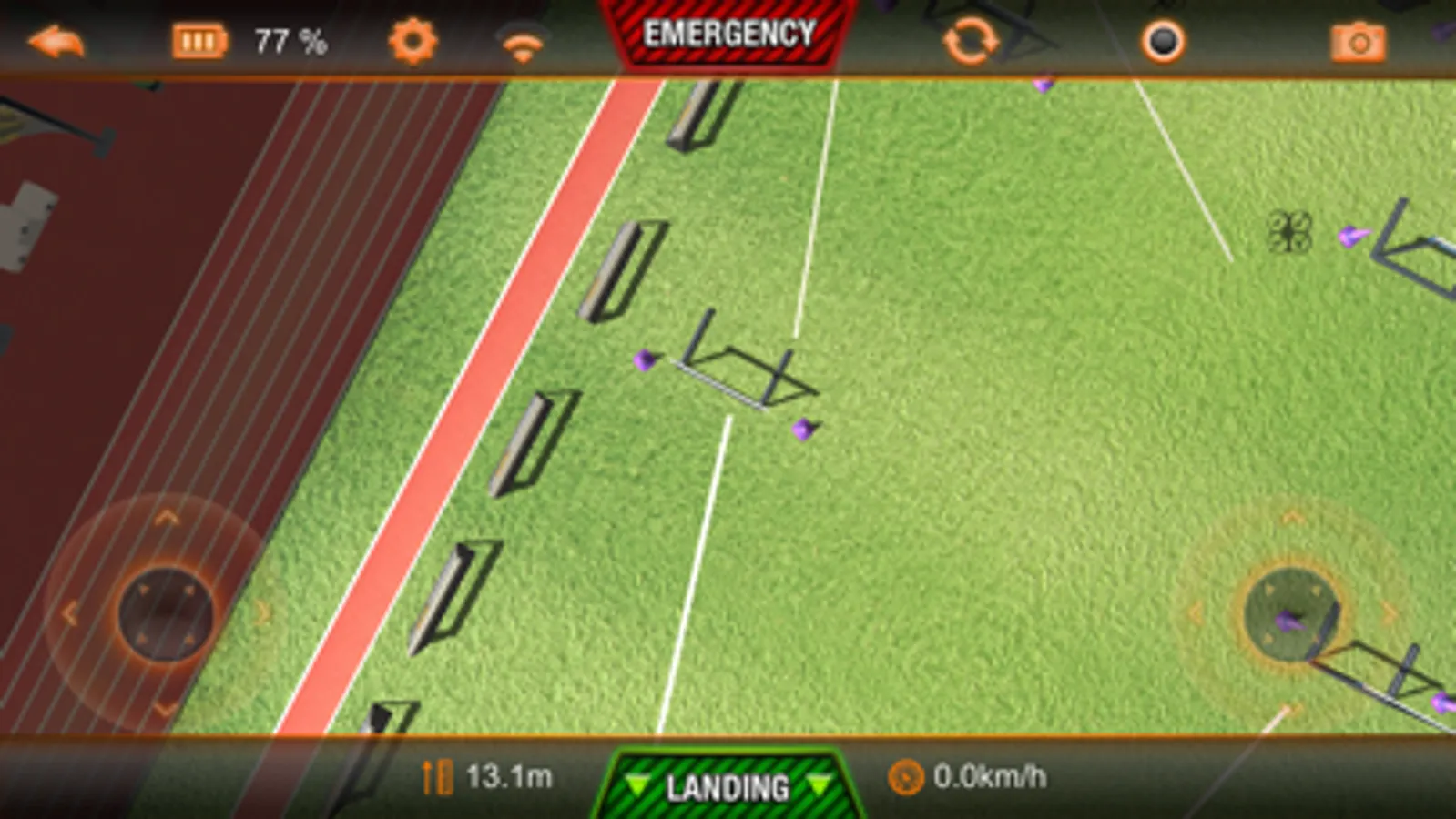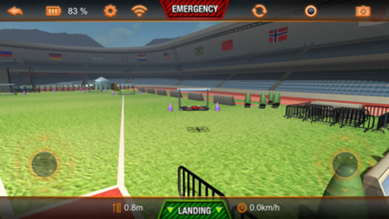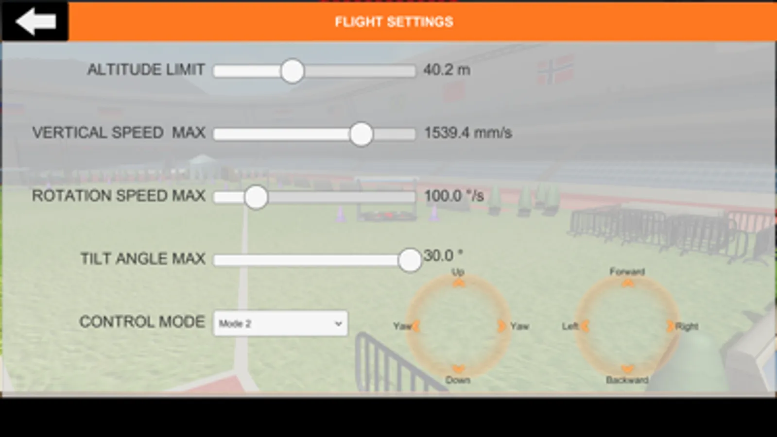Settings are reduced to the most import ones for the simulator: max. altitude, max. vertical speed, max. rotation speed, max. tilt (controls the max. forward speed)