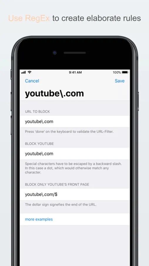 The rules are based on regular expressions, allowing fine control over a blocked URL. For example, you can block the landing page of YouTube and still watch individual videos.