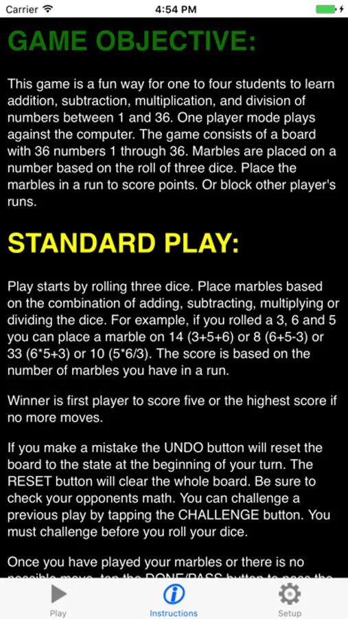If you make a mistake the UNDO button will reset the board to the state at the beginning of your turn. The RESET button will clear the whole board. Be sure to check your opponents math. You can challenge a previous play by tapping the CHALLENGE button. You must challenge before you roll your dice.