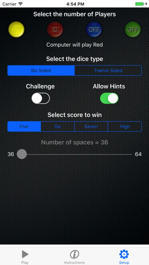 Winner is first player to score five, six or seven points (selectable in setup) or the highest score if no more moves.