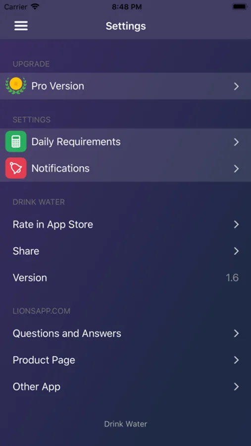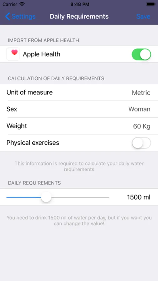 - Calculates your daily water requirement and if you change weight over time it recalculates your requirement (it is only a recommendation).