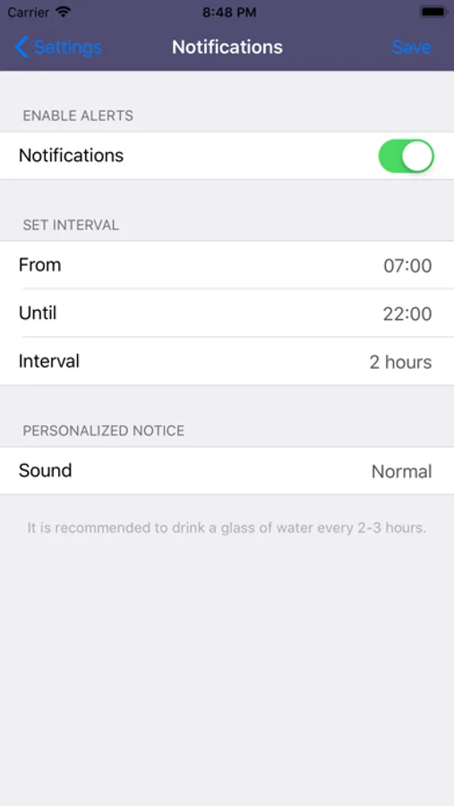 - Enable notifications and you will be reminded to drink when you need it.