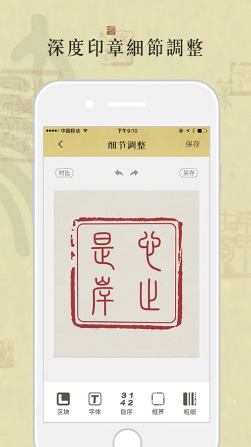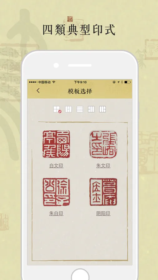 《云篆刻》4种印文选择,支持区块调整,字体更改字序更换,边框更改,字界增减以及字体调整。