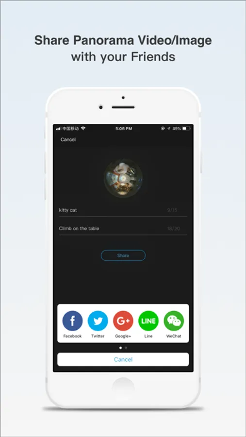 3.User can share panorama pictures or videos to friends .