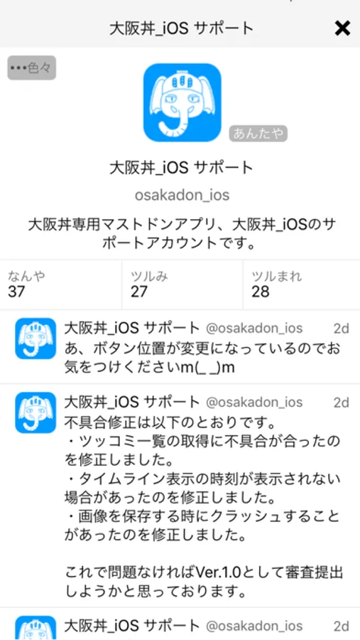 問題点や要望・バグ報告などありましたら、大阪丼iOSサポートアカウント( https://mstdn.osaka/@osakadon_ios )までよろしくお願いします。