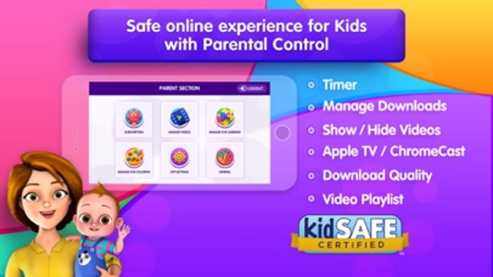 ChuChu TV app allows you to download our video songs offline and watch them anywhere, anytime on any mobile device. This app provides a safe and kid-friendly viewing experience for kids of all ages. This app is easy to use and has been designed especially for kids. We care about kids privacy and safety, so the app will never collect any personal data. In addition, this nursery rhyme video app has parental controls and all the content can be managed and filtered by parents.
