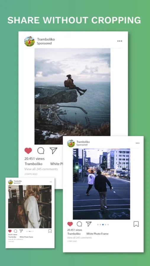 Our user friendly app gets you around having to crop your photo before you upload it to your social media or any other service that wants you to crop or resize it first. The app adds the necessary whitespace around your photo to make it fit. You can use it after you take a photo, or load up photos you've previously taken, and before you hit upload; you can choose to share the same photo on your profile, or to just save the final product to post later.