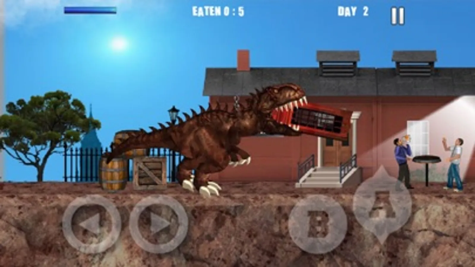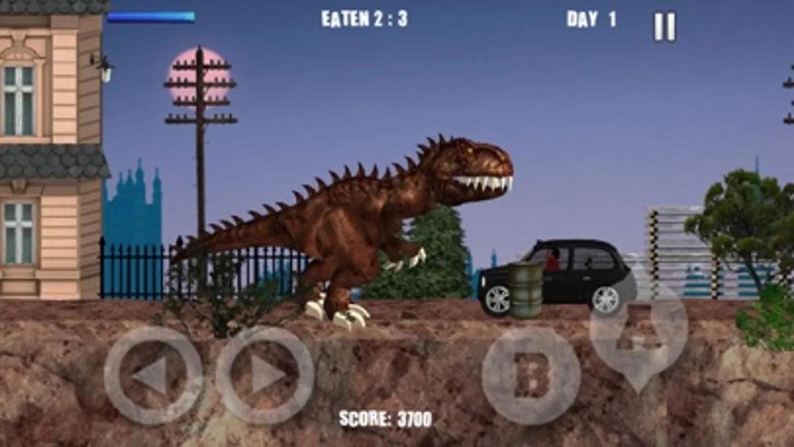 You are a Tyrannosaurus Rex in the middle of London. As you make your way out of it, eat humans including policemen and ordinary citizens, destroy cars and houses, and battle helicopters, tanks, and a lot more armored vehicles.
