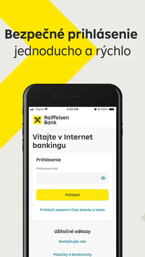 To log into Raiffeisen Bank Internet Banking, enter your client number (given in your Framework Contract with us) and your Internet Banking password, and then confirm the login using the code you receive from us in an SMS. After logging into Internet Banking using the Raiffeisen Bank SK application, you can create a quick login option. When using the quick login option to access Internet Banking, simply enter your own numeric login code. This code is only valid for the mobile device and the browser you used to activate the quick login option.