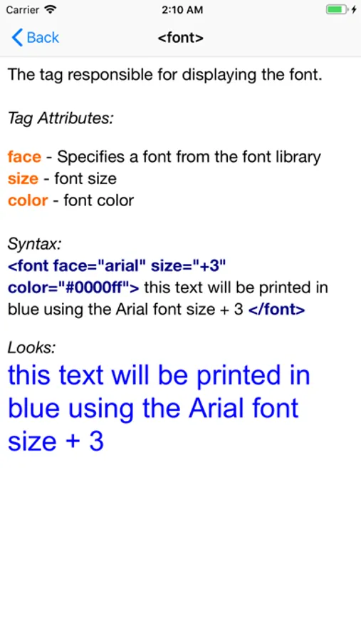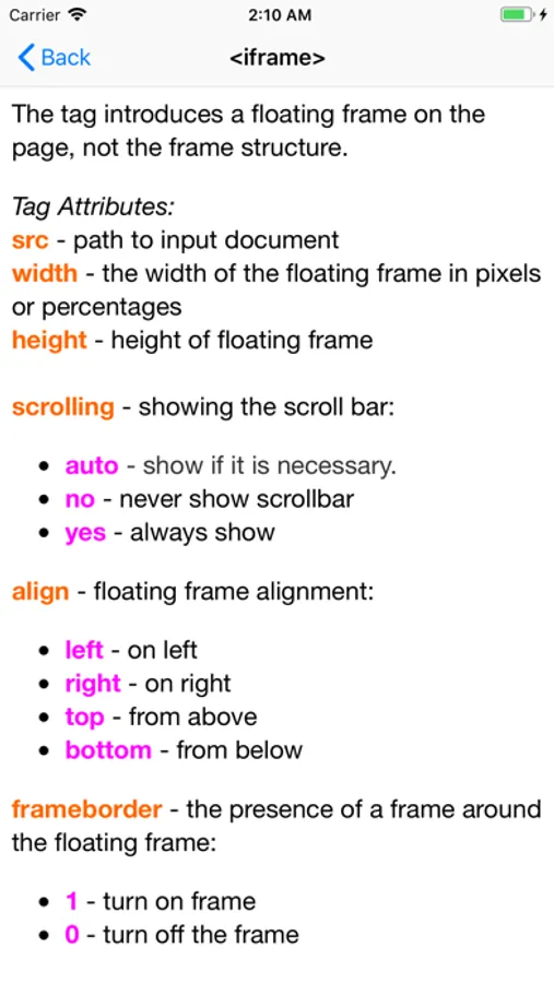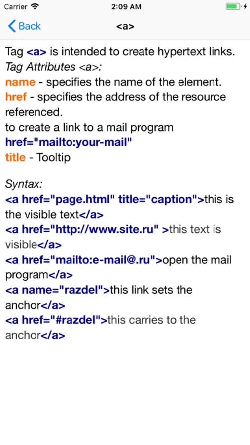 The reference book contains a list of html tags with a detailed description of each tag and examples of work with examples of work for most tags.