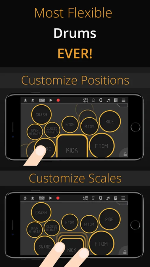 Sick of drums which are too small or in wrong place for your fingers? Flexy Drums is the best mobile drums you have been looking for. Customize the position and scale of each drum part for your finger drumming needs. Play, record and enjoy improving your skills without any disturbing Ads. Flexy Drums is a free app but some in-app features such as Save, Load and Export to MIDI will require payment.