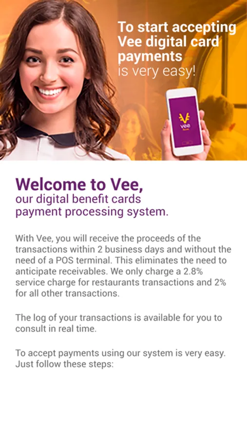 The use of Vee Business is for retail establishments only. You must be accepted as a qualifying business by Vee. Please complete the registration form on our website http://www.vee.digital. To date, the commercial sectors accepted by our network are: restaurants, canteens and coffee shops, food retailers, gas stations and the arts.