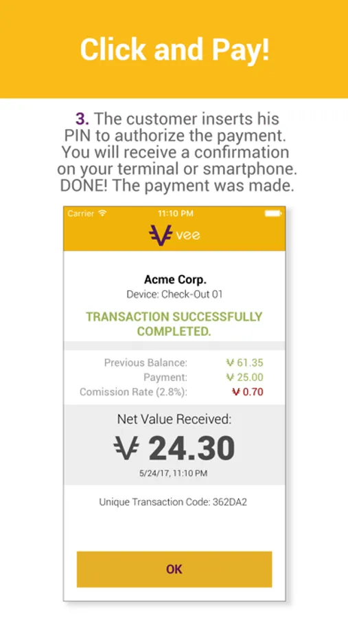 With Vee, all you and your client need is a mobile device. No card or PoS terminals.