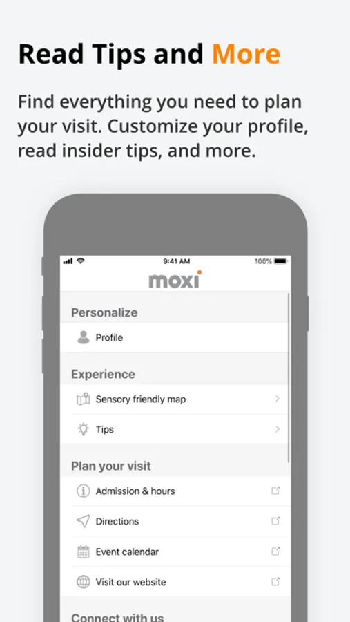The MOXI app was developed to help all families, especially those with disabilities or young children, to prepare for a day at the museum. In the app, you’ll be able to learn more about our exhibits, create your own schedule for the day, play MOXI matching, and check out features like our sensory-friendly map and insider tips.