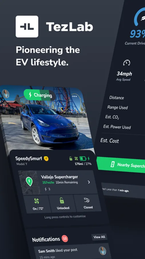 We get EVs. From saving money, getting the most from your battery, road-tripping, and daily commuting, it’s no wonder TezLab is the #1-rated Tesla and Rivian app in the world for you and your EV. Get insightful drive details, track your drives and charges, and more—helping you save big every mile.